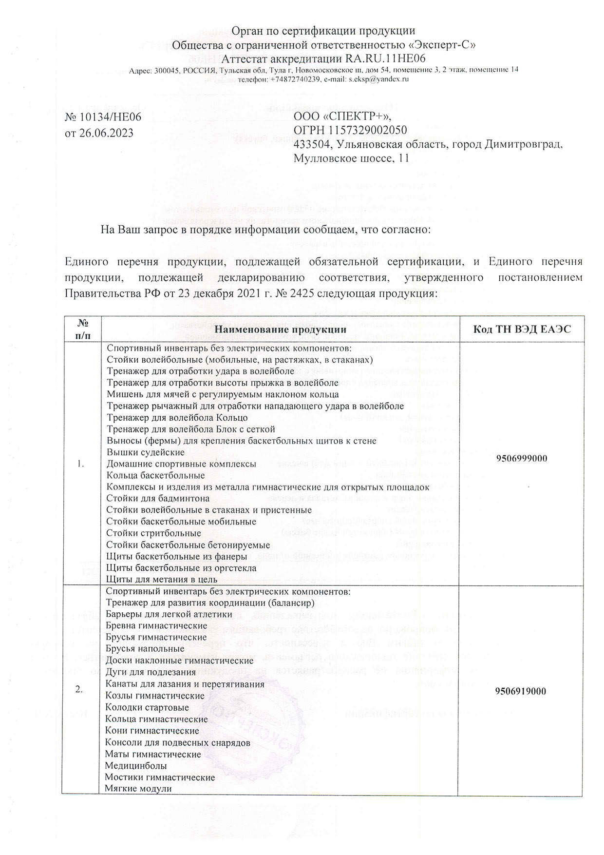 Сертификат соответствия инвентарь 2